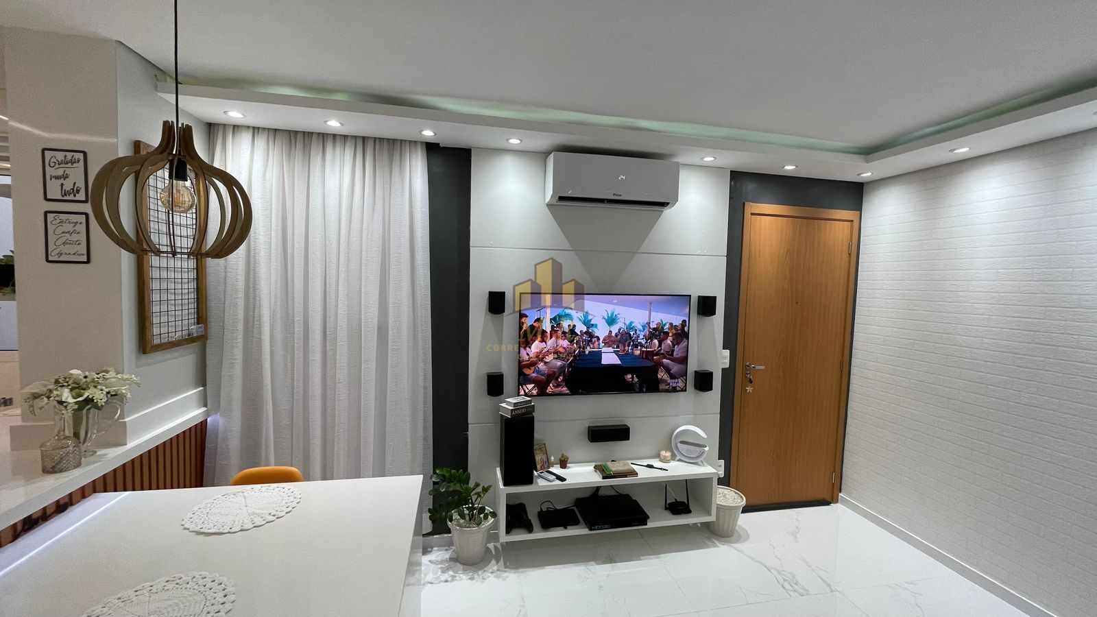 - 🛋️ Sala de estar e jantar integradas, com móveis planejados, painel e mesa com 4 cadeiras